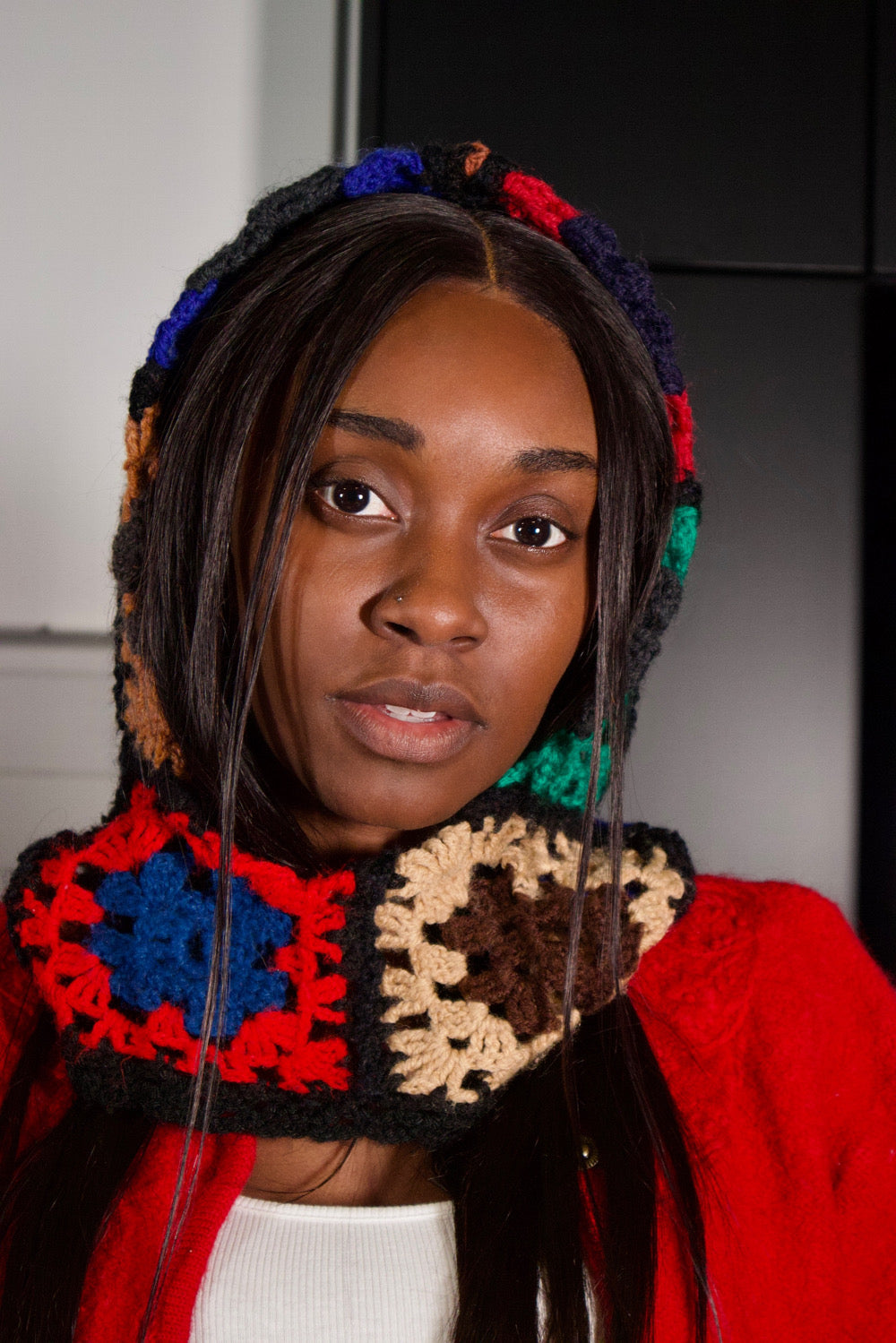 Voici la sélection; Balaclava en tricot multicolore fait à la main dans la collection Bloom. Nous avons crée ce balaclava à partir d'un rouleau de tissu seconde main. Nous avons utilisés des fils noir pour faire les coutures. Ce modèle ce vend en deux tailles qui se caractérise par la largeur du tour de tête.