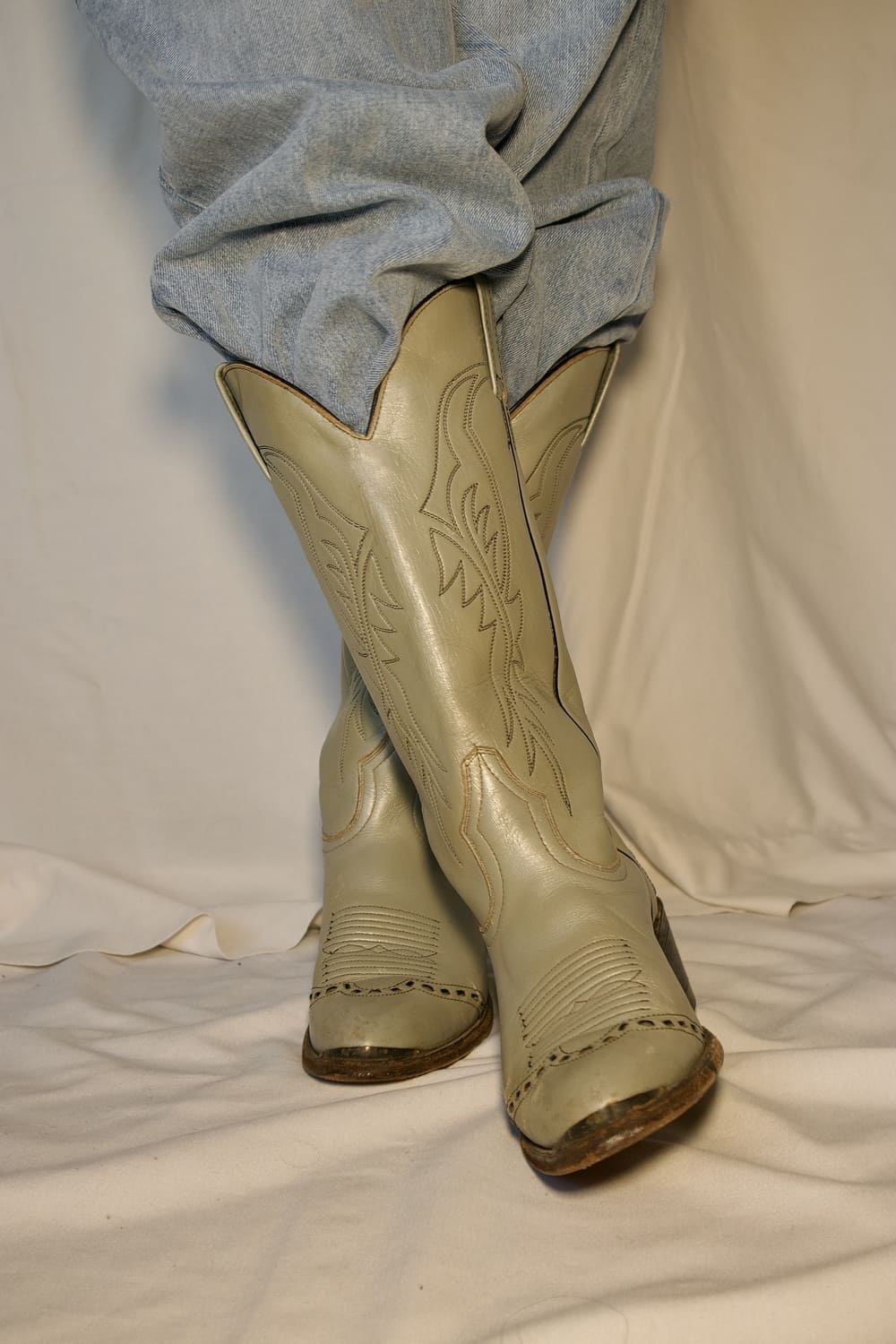 Bottes de cowboy vintage d'une couleur pistache de la marque Boulet. Avec des détails originaux et uniques. Un de nos coup de coeur qui deviendras possiblement votre indispensable.