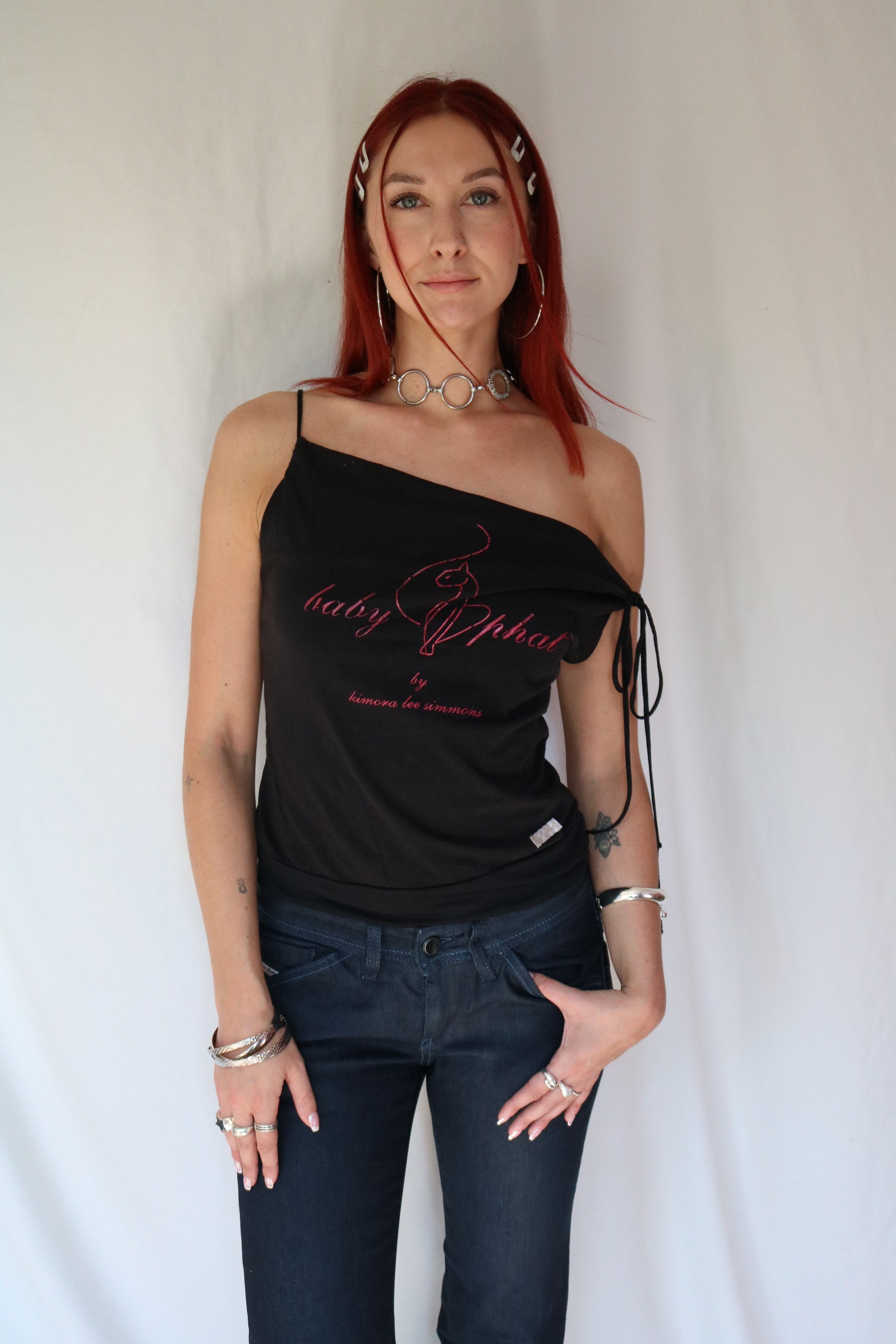 Camisole noir avec une manche en boucle de la marque Baby Phat. Logo Baby Phat rose à l'avant.