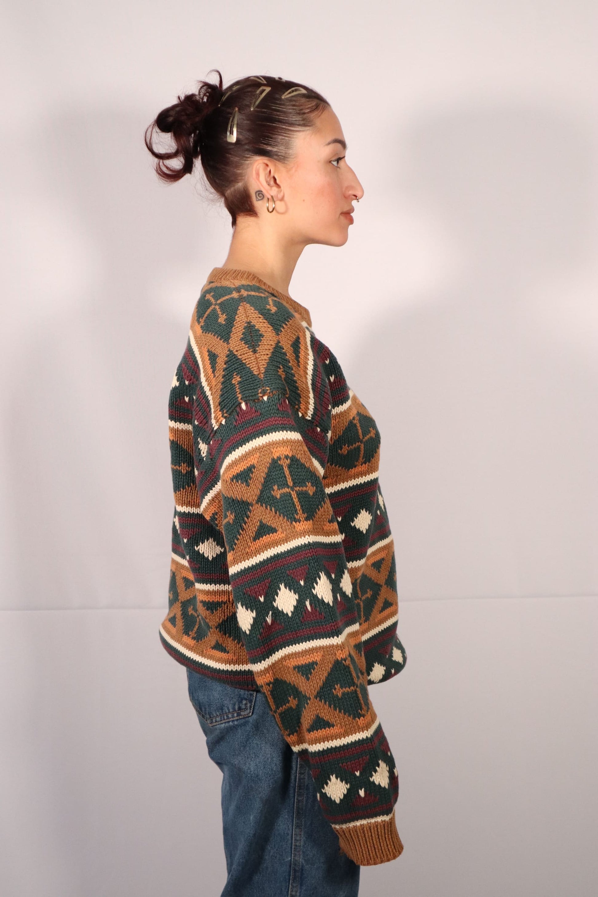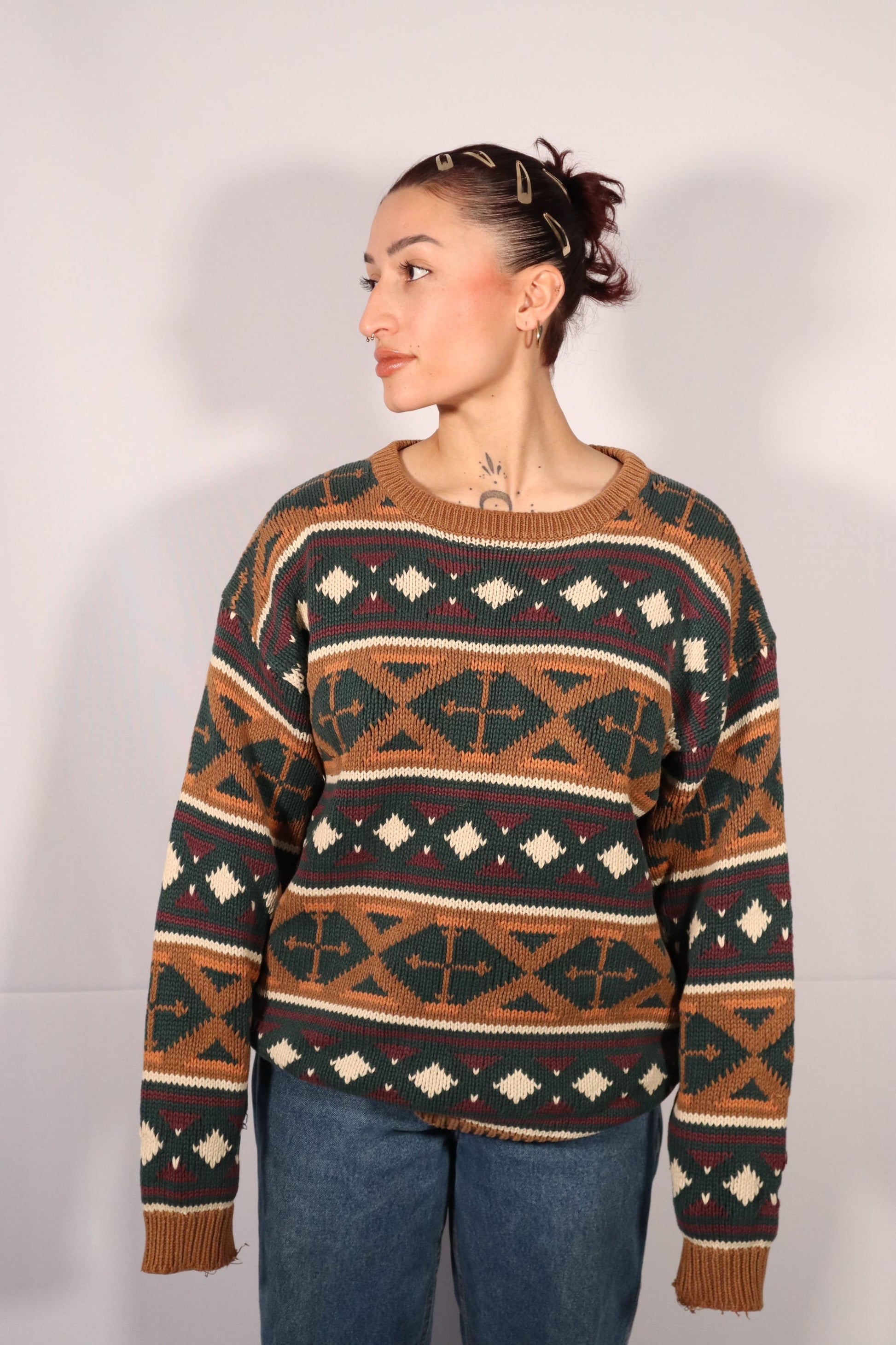 Dans la catégorie Reshop, voici la sélection; Chandail de la marque Canary Island. Ce chandail a un motif de couleurs dans le tricto; beige, vert et banc.
