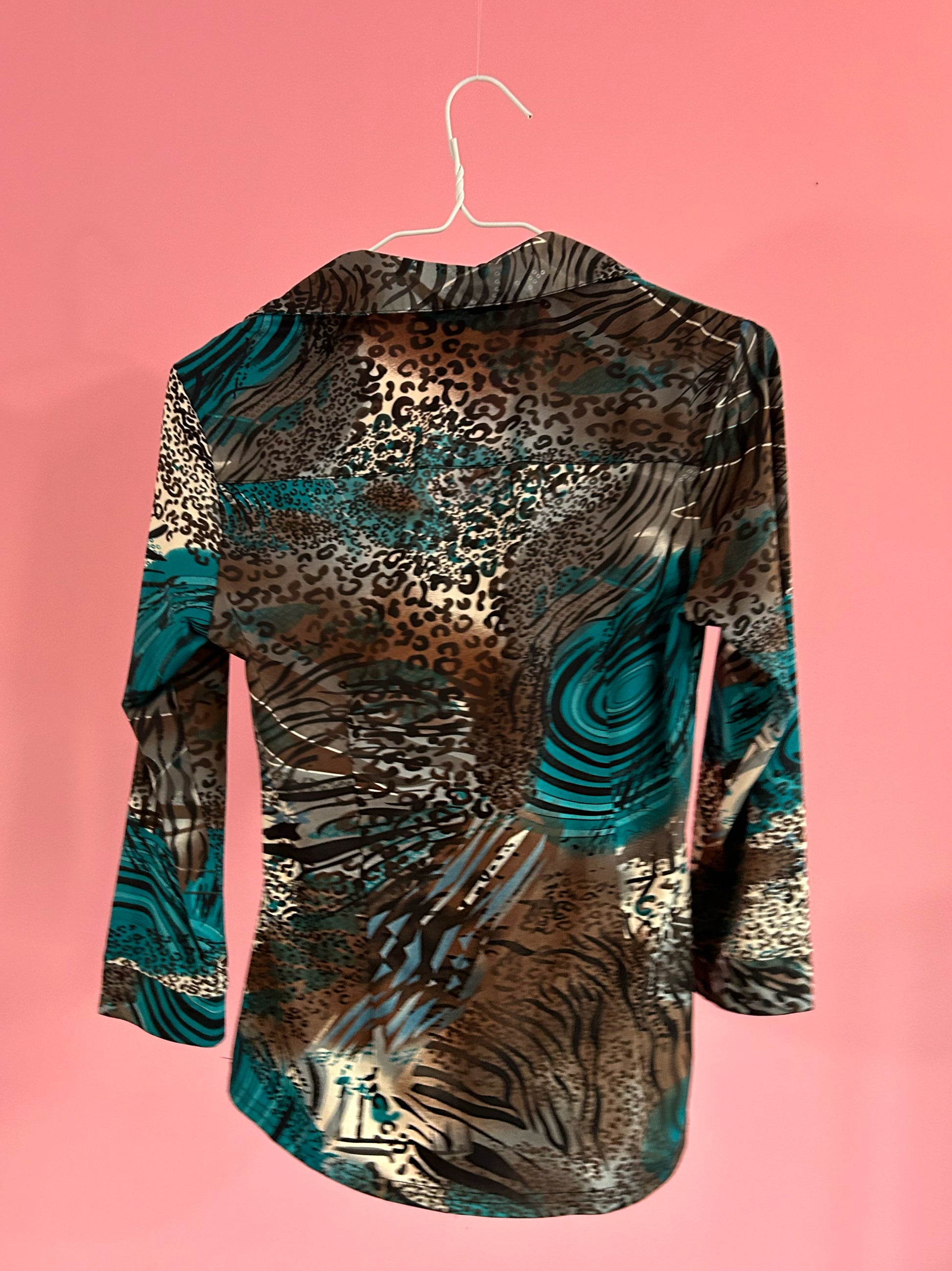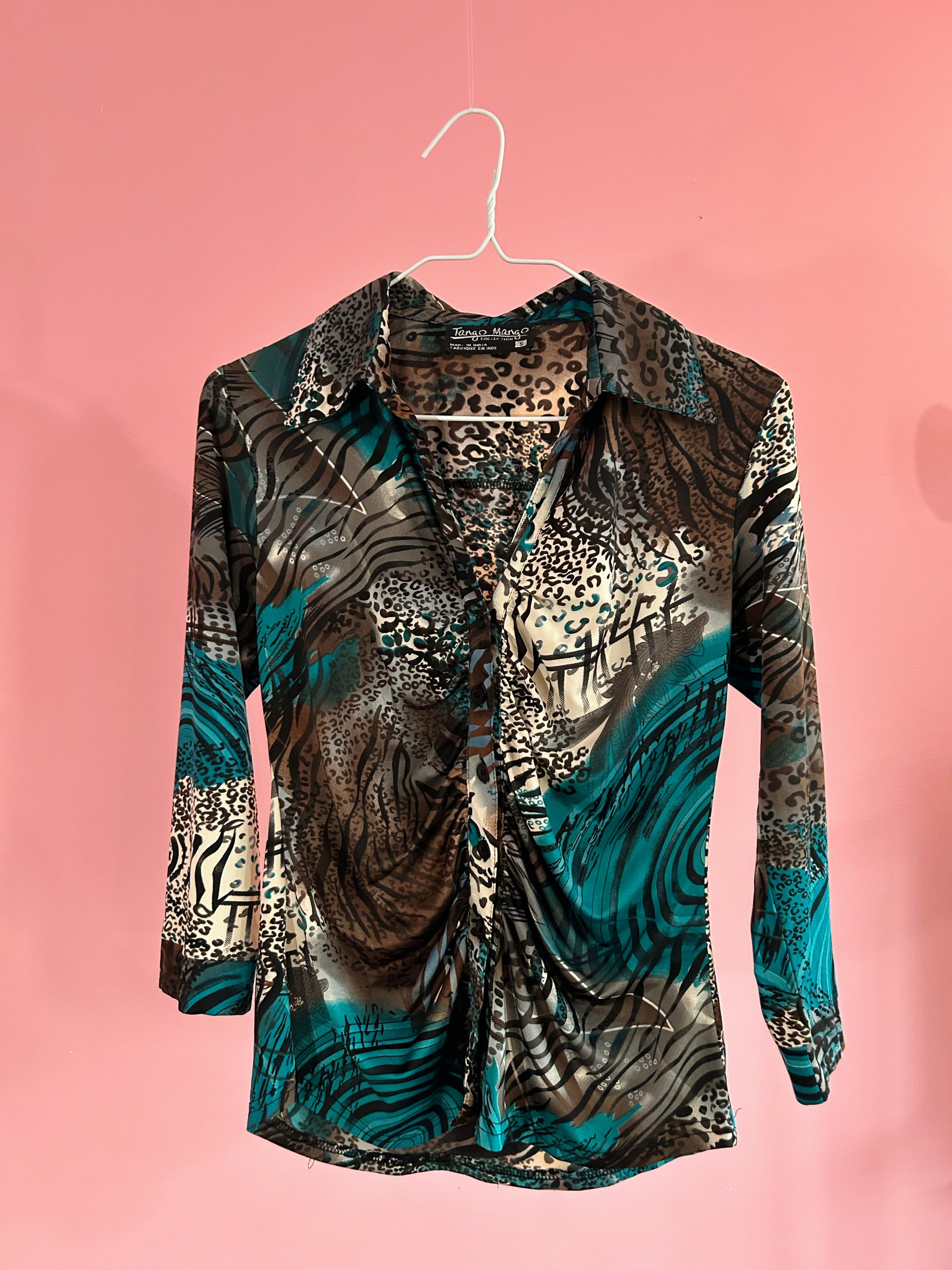 Chemise à motifs léopard turquoise et brune de la marque Tango Mango. Un punch de couleur et de motifs indispensable pour vous.