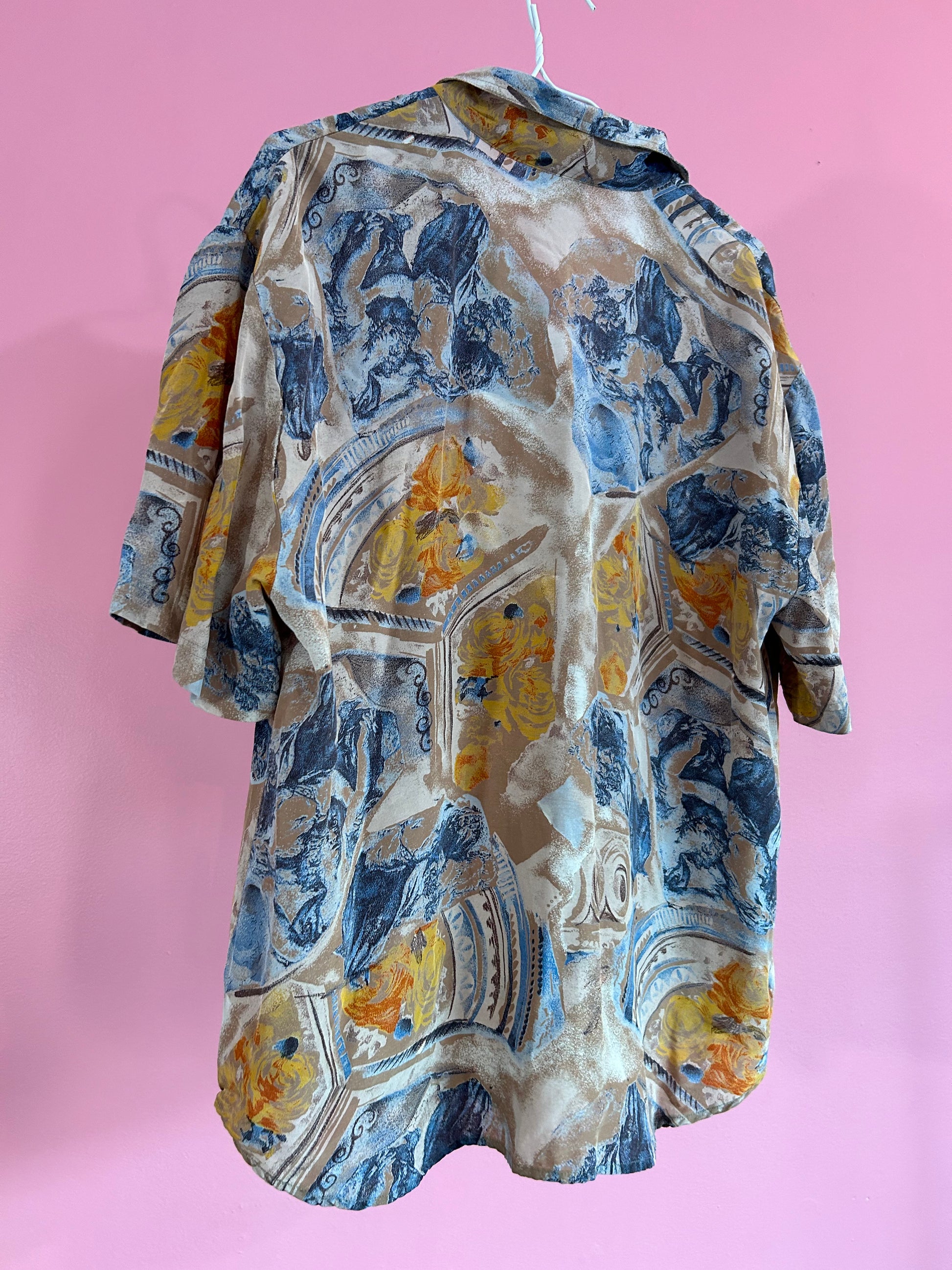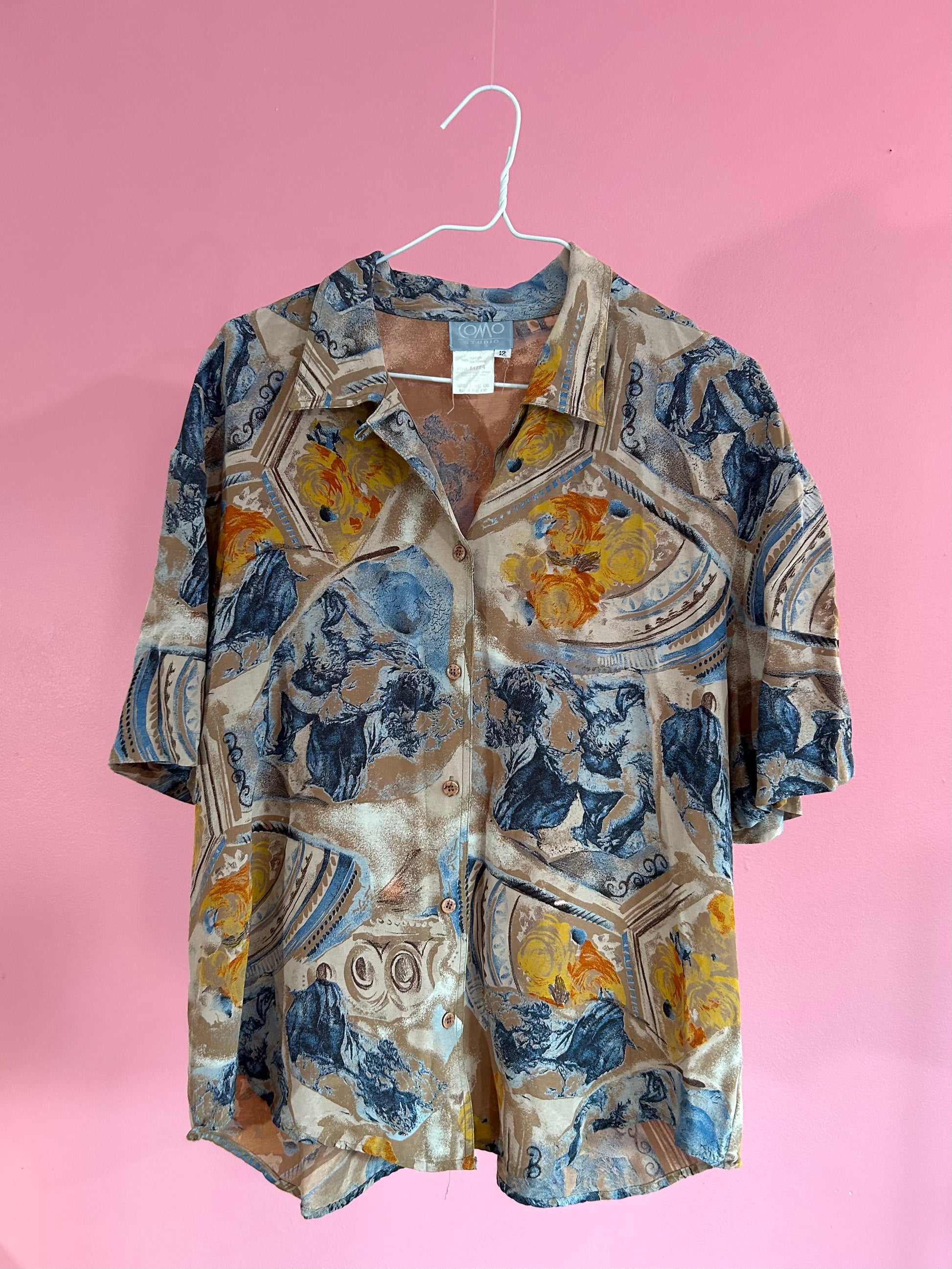 Une chemise manches courtes de la marque Como Studio. Cette chemise baggy a un patern du style des peintures Picasso dans des couleurs chaudes de jaune, orange, beige et bleu. C'est un produit coup de coeur pour nous.