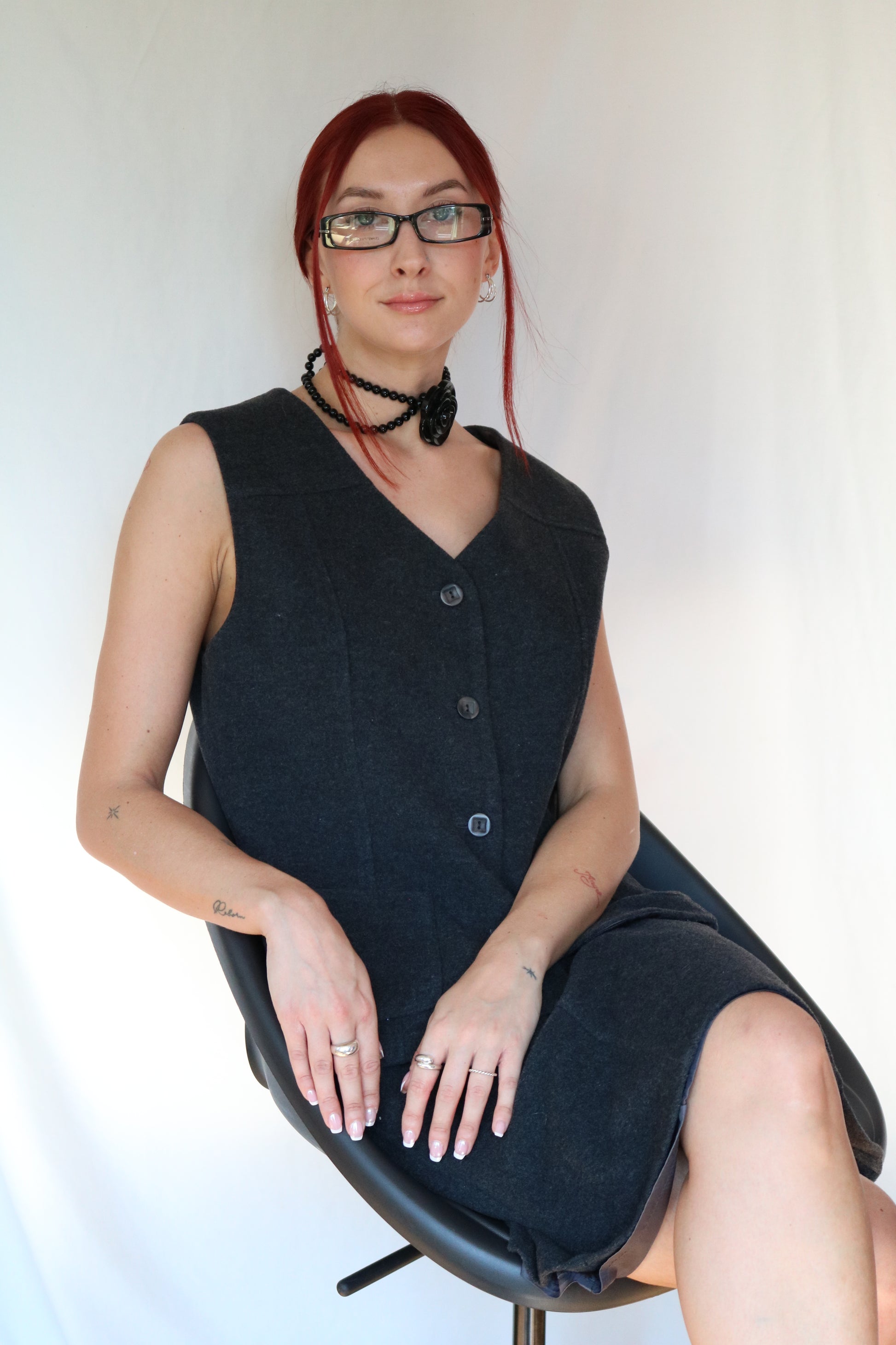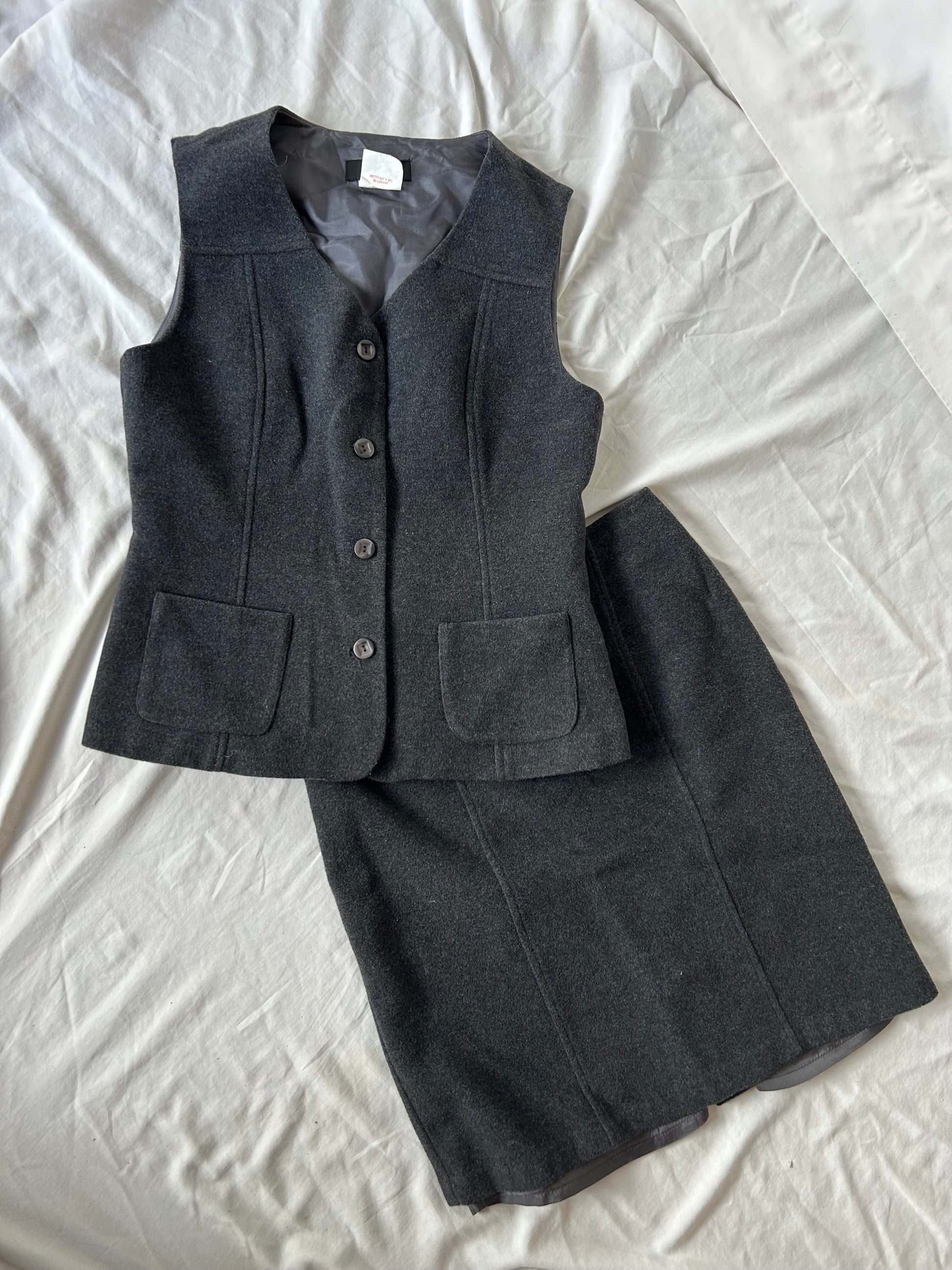 Un ensemble deux pièces de la marque À LA UNE. Cet ensemble est constitué d'une veste sans manches et de la jupe. C'est une coupe droite classique qui arrive au niveau du genou.