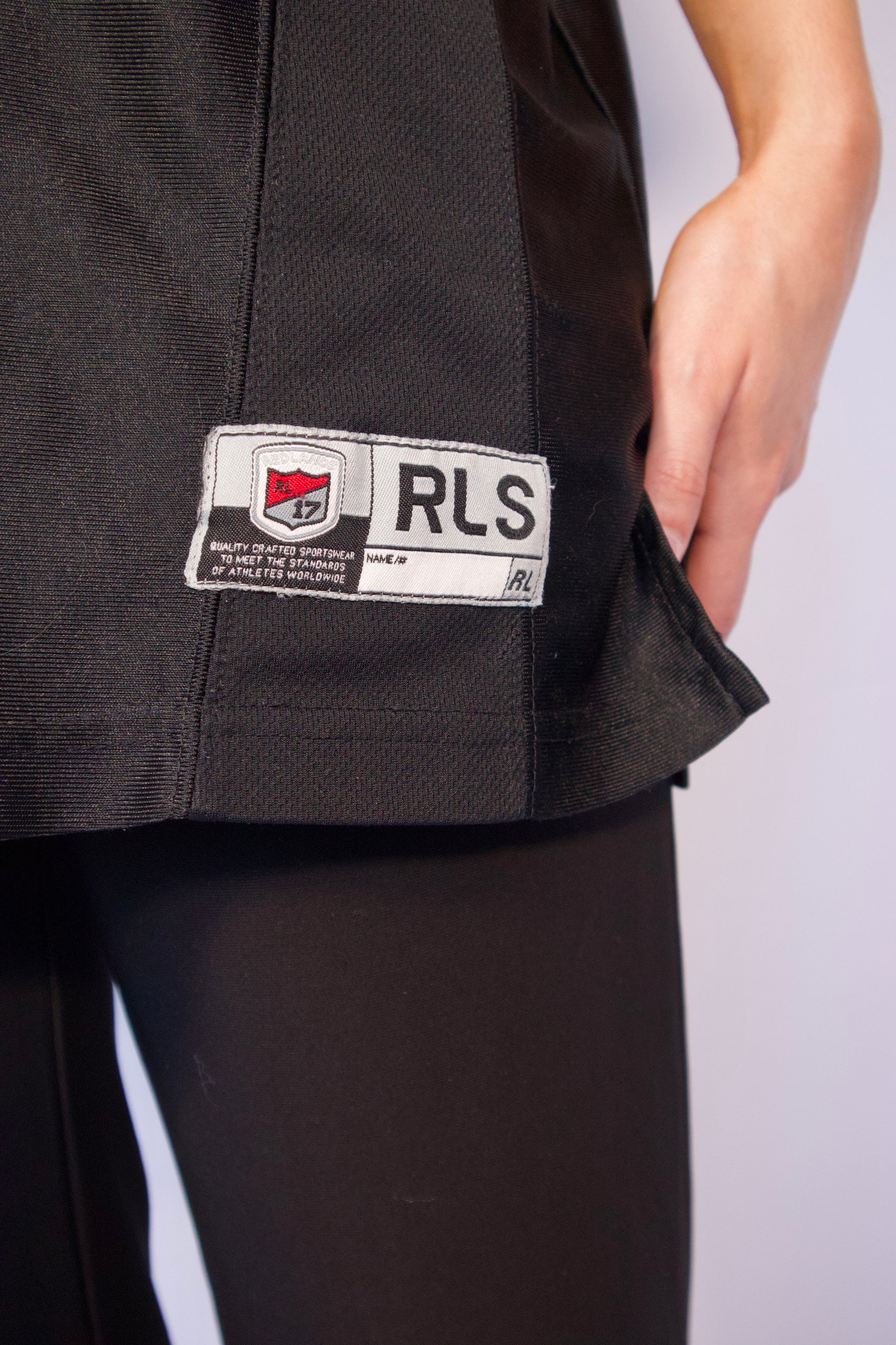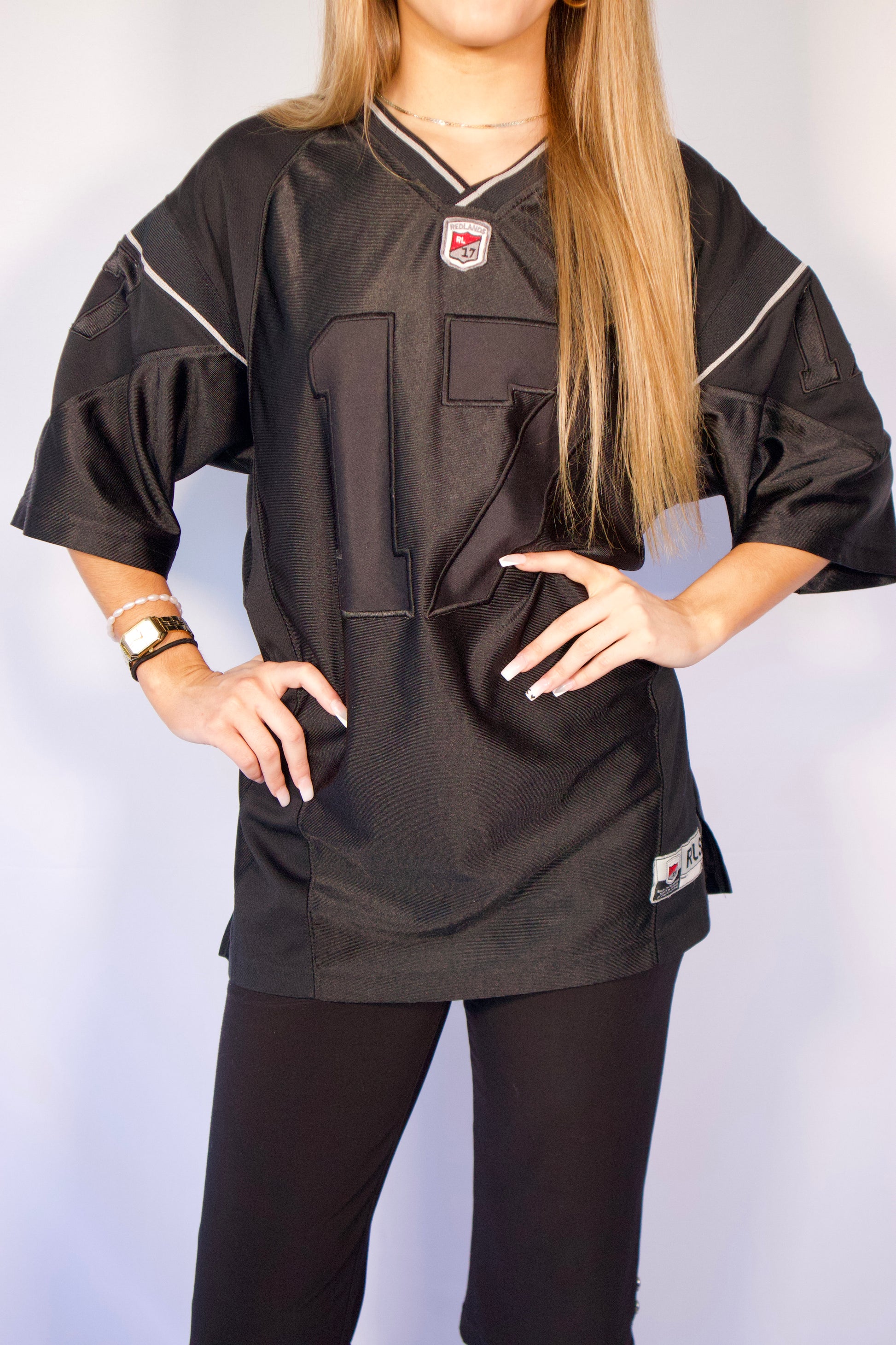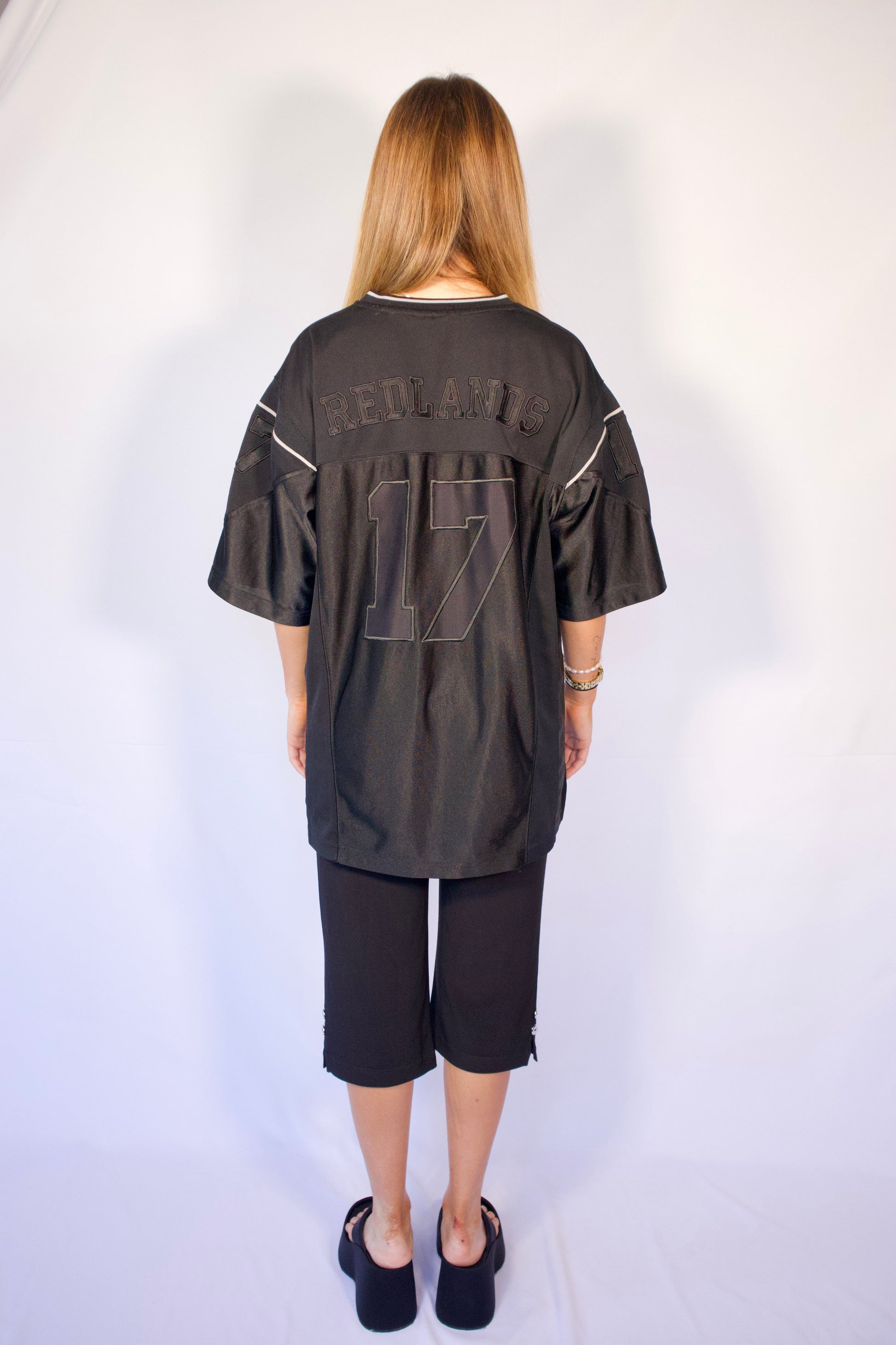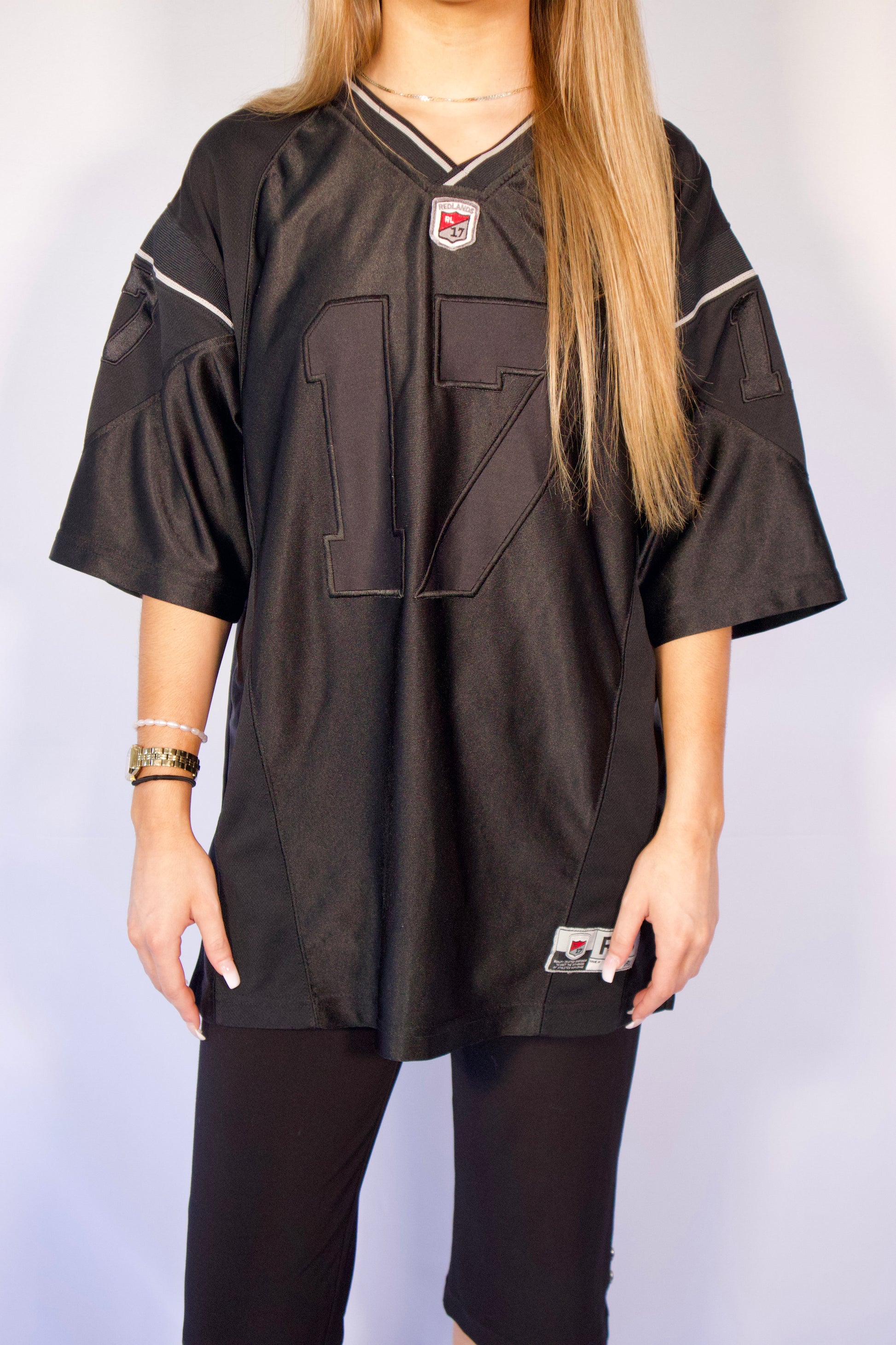 Jersey de football oversize noir, brodé du numéro 17 à l’avant et à l’arrière, avec l’inscription « Redlands » dans le dos. Épaules légèrement structurées, manches courtes amples et col en V à liseré contrastant. Style sportswear authentique, idéal pour un look street casual.