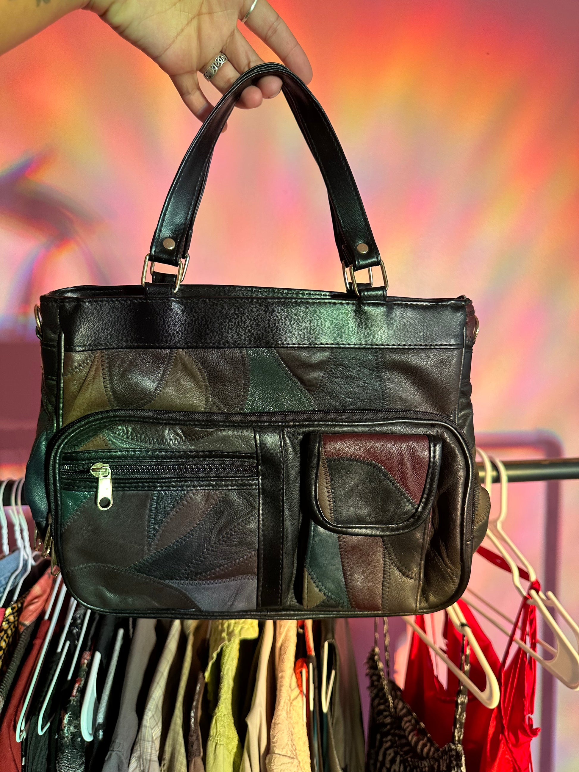Sac à main en cuir de la marque Zeca. Design en style patchwork de couleur rouge vin, bleu, brun et vert.
