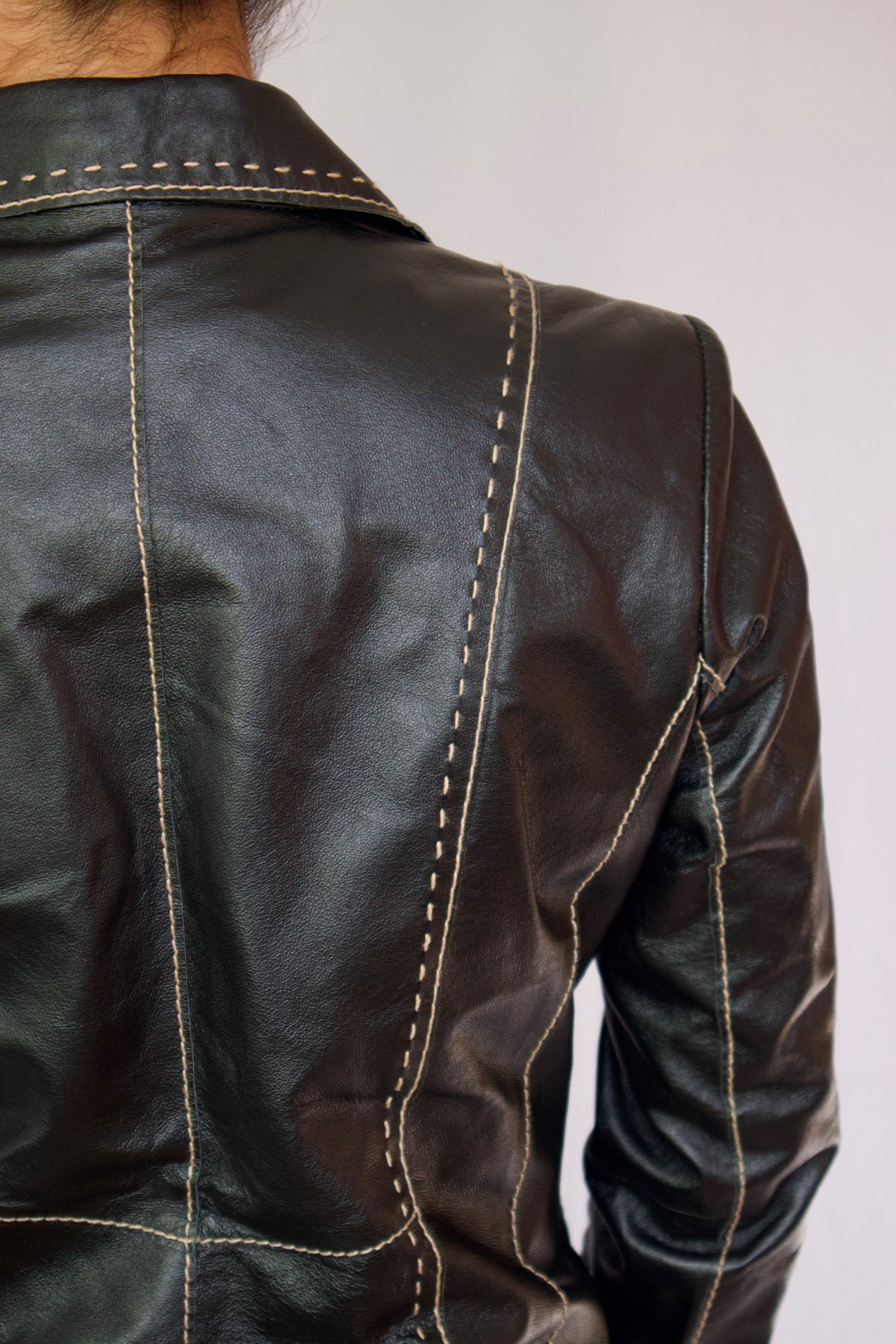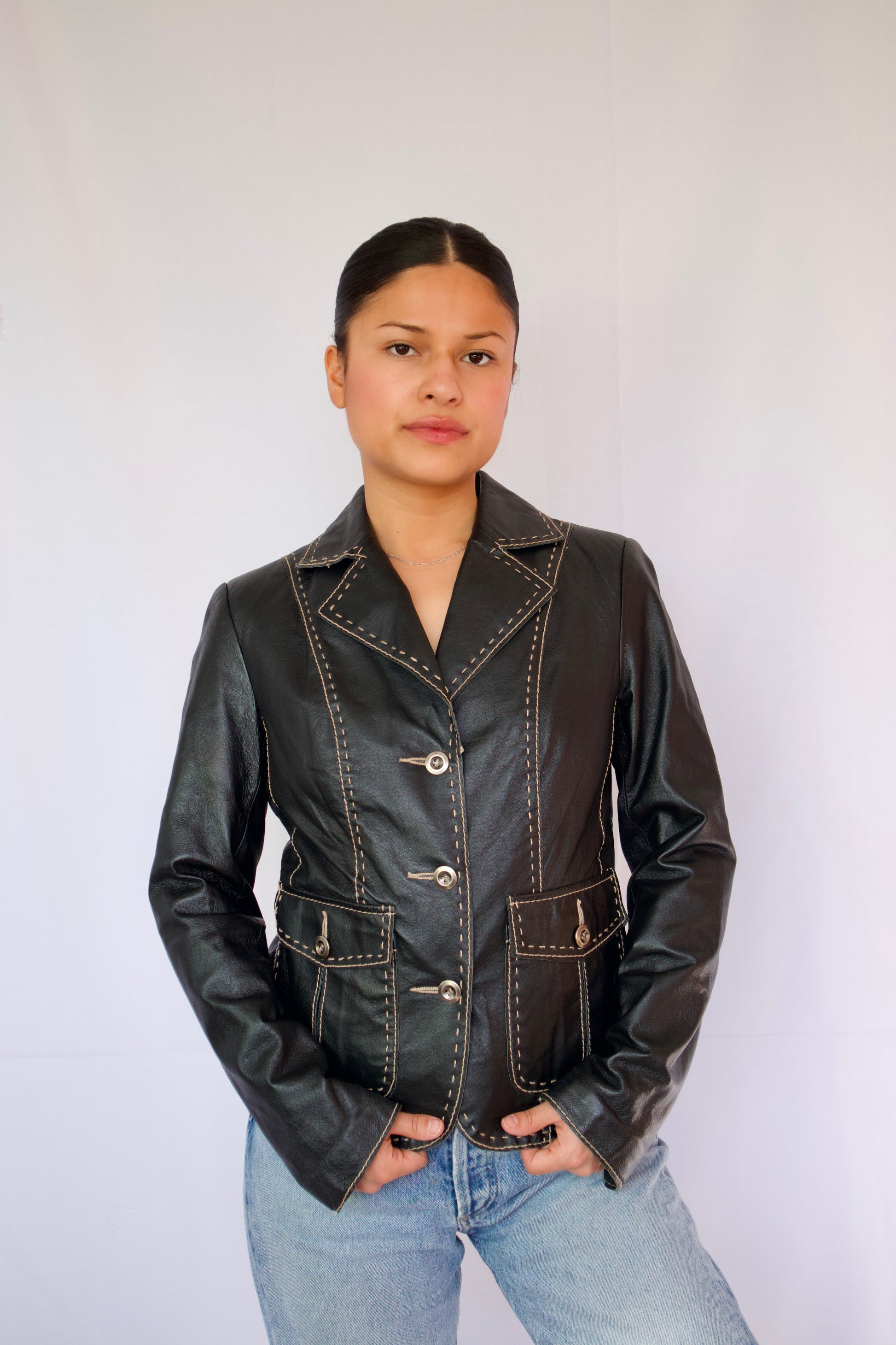 Voici la sélection; Ce manteau en cuir de la marque Terra Nostra présente une couture beige, une coupe droite, des poches à l'avant et une fermeture à boutons. Il a une allure élégante et classique, tout en restant raffiné et intemporel.